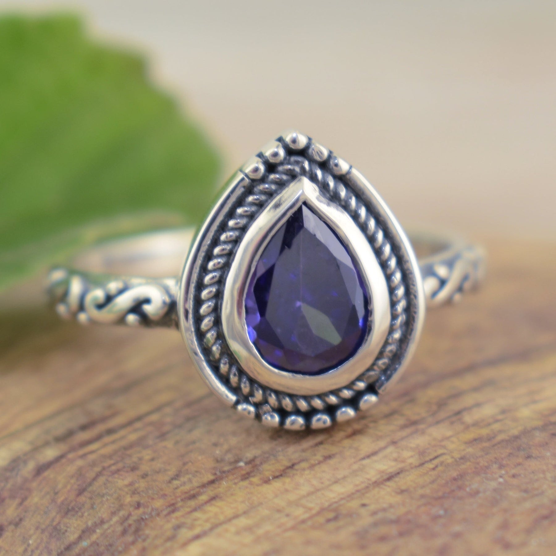 Introducing our sweet Carolina Plum Ring, where elegance meets a dollop of fun! This designer piece is crafted in sterling silver and features a deep purple CZ. Our ring displays a dazzling, bezel-set pear-shaped CZ—a juicy 7x5mm gem weighing in at about .60 carats—glistening like a purple droplet of happiness on your finger! The front of the ring boasts a chic 12.9mm width, while the band is a sleek 2.2mm. Brighten your day, or glam up your night - this ring adds a pop of color and joy to any outfit. Get ready to show off your style with a ring that's plum delicious! 🍇✨