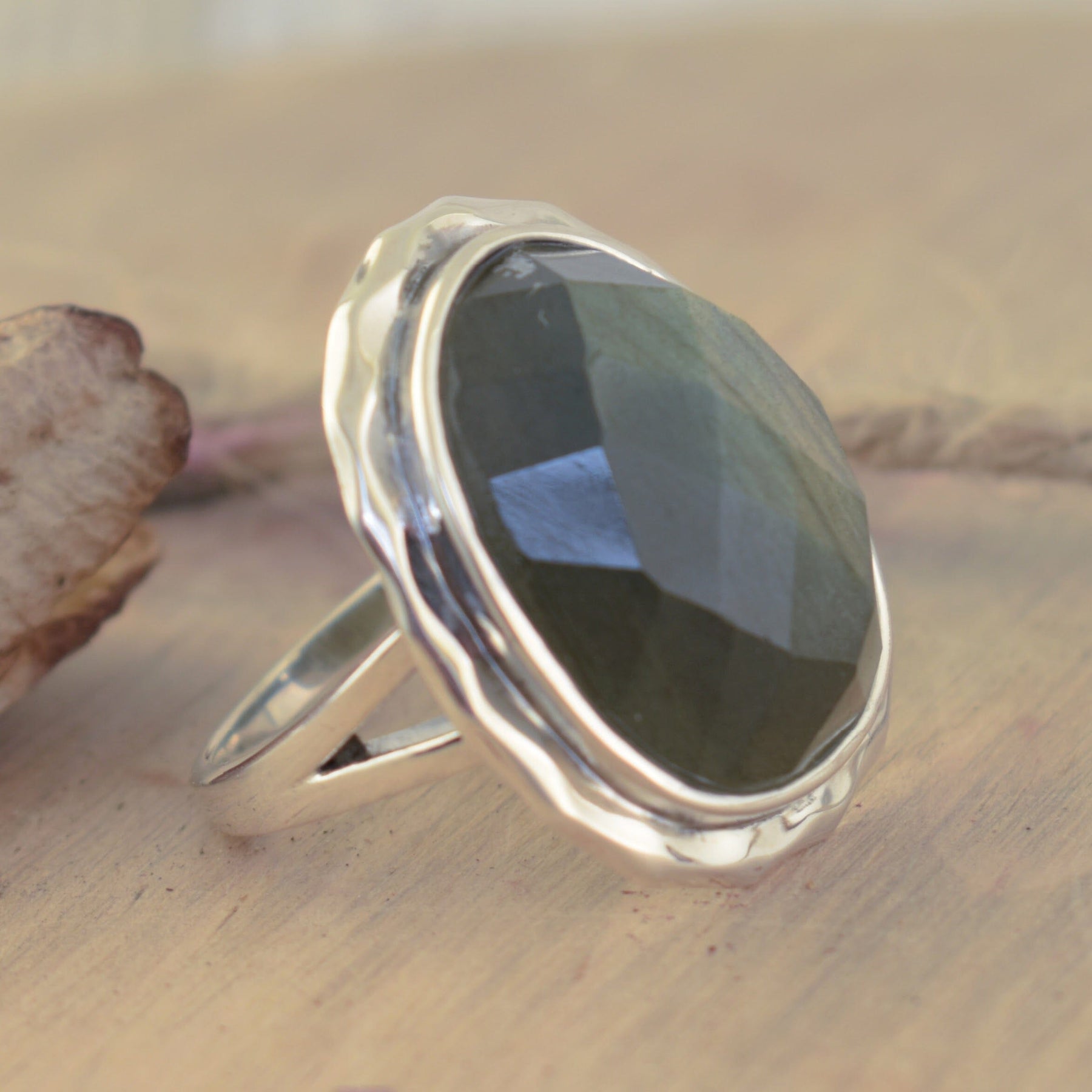 Get ready to dazzle with this stunning labradorite ring that's all about making a statement! Give them something to talk about—with dazzling flashes of blue and silver that dance in the light, this ring is perfect for those days when your vibe is anything but ordinary and your ticket to turning heads and sparking curiosity. This designer showstopper ring measures 25mm wide in the front and tapers all the way down to 2.25mm. The featured faceted labradorite shines in a ruffled bezel and measures 19x15mm, displaying over 8 carats of stormy to partly cloudy glam! So go on, keep everyone guessing with this new dreamy mood—because predictable is so last season!