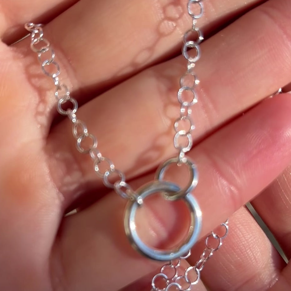 It Takes Two Necklace comes to you in handcrafted sterling silver, measuring 16 inches. If you prefer a longer length, you can select 18 or 20 inches for a small additional fee. The center front features an interlocking set of circles, with the larger measuring 14mm and the smaller 8mm. It's simple and will quickly become your go-to necklace.