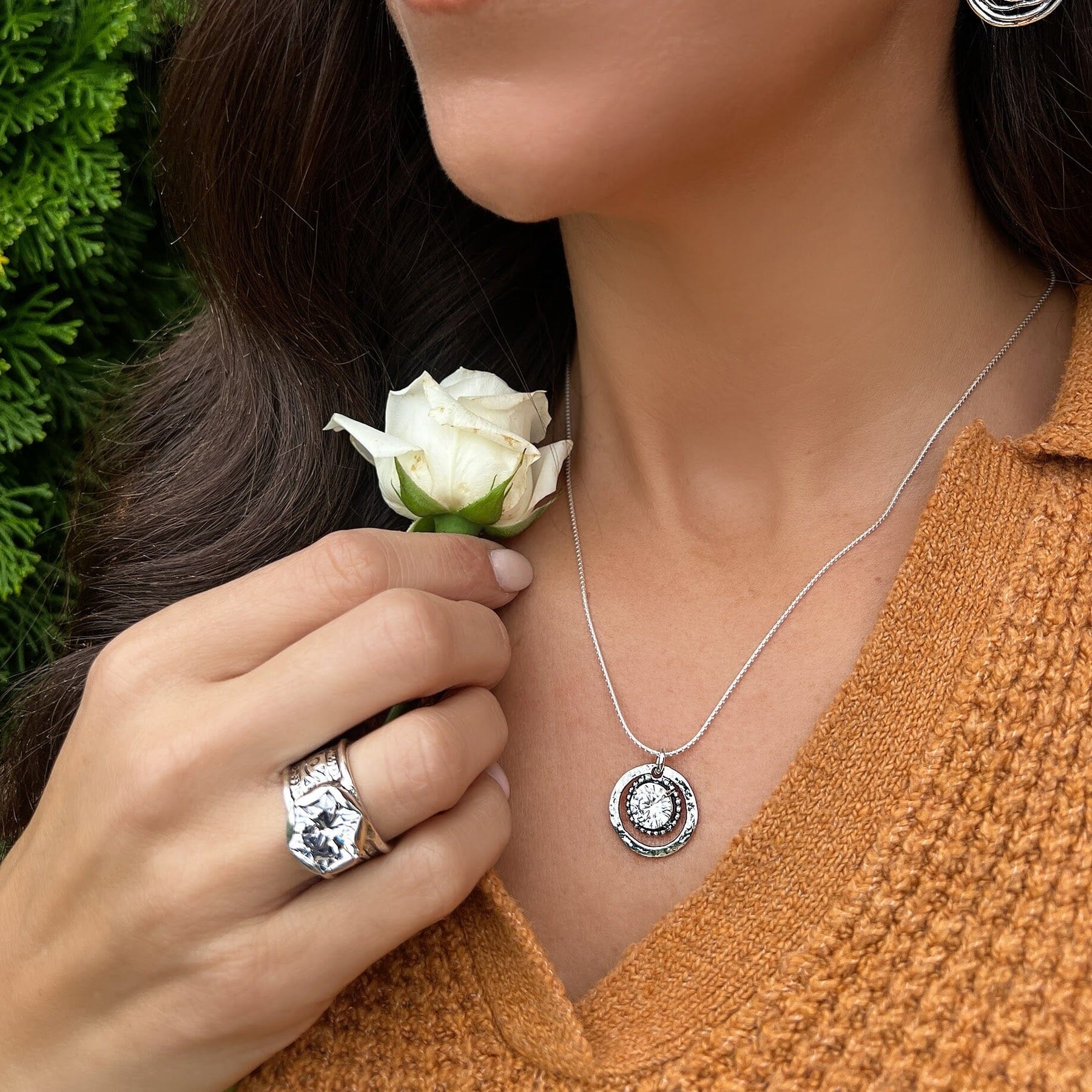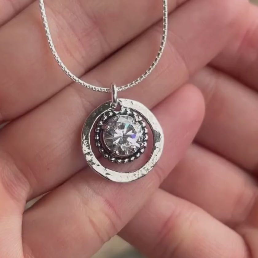round sterling silver necklace pendant with an inner ring holding a prong-set cz stone