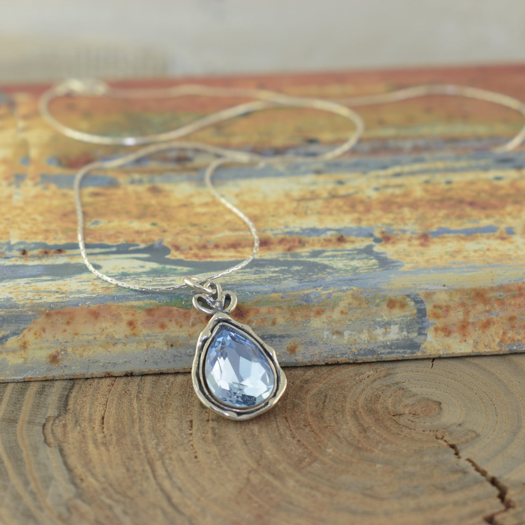 teardrop shaped sky blue pendant on a sterling silver chain