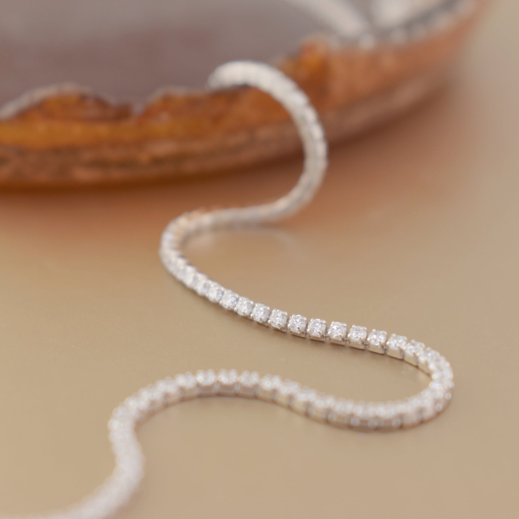 A whisper of glam with runway attitude.  The Sleek Vogue Line Necklace delivers understated yet scene-stealing sparkle in a refined tennis silhouette.  The delicate choker measures 1.25mm wide and holds 2mm CZ stones in an attention-getting line.  Dainty yet dazzling, it layers like a dream or stands solo with quiet confidence.  Because when your shine speaks for itself, words are optional.