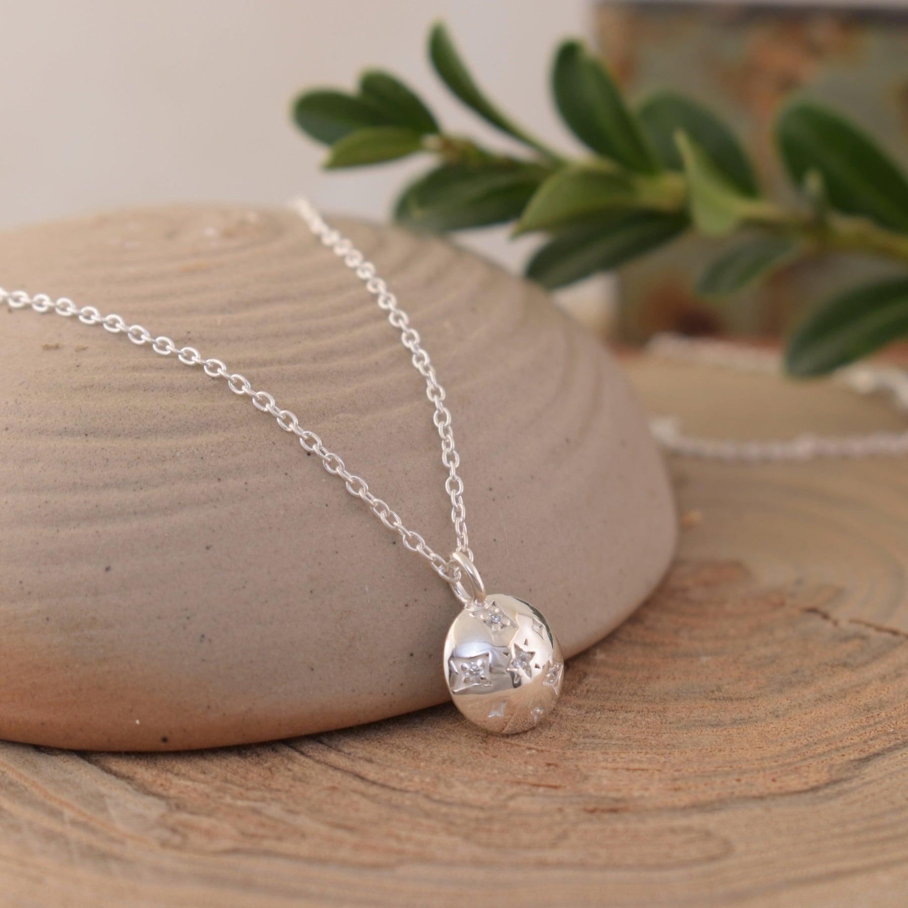 When sparkle meets the stars, you get Starstruck.  Our silver designer necklace features a round domed pendant (about 10mm) dotted with twinkling starbursts and sparkling accents, capturing the wonder of a midnight sky.  Bold, bright, and impossible to ignore - it's the piece that makes every look stellar.