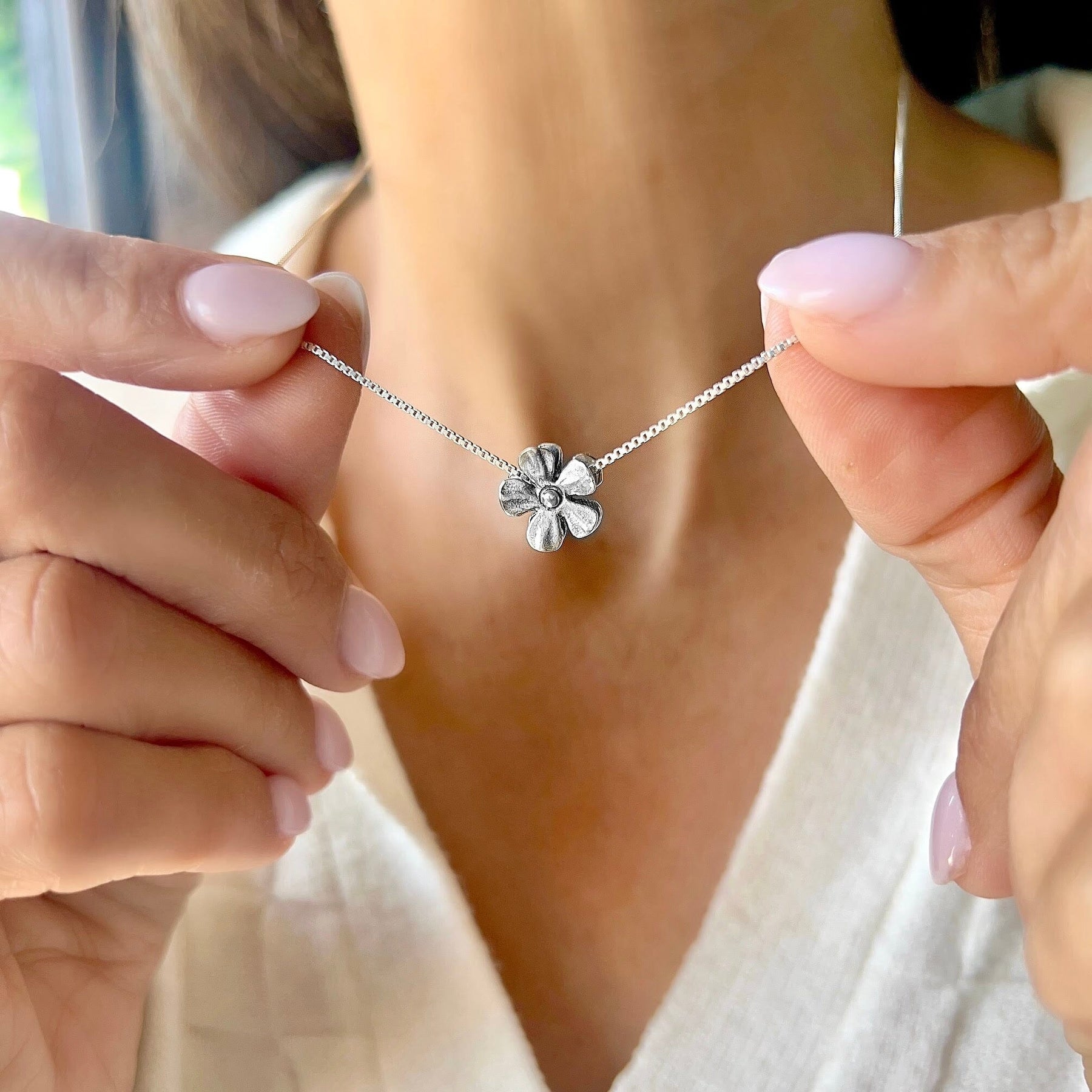 Our Susannah Necklace is crafted from sterling silver and measures approximately 18 inches in length. If you prefer a longer length, you can select a 2-inch extender for a small additional fee for a full 20 inches. The adorable flower pendant measures about 11mm and slides along the chain, finding its way to the center. Our Susannah Necklace brings a delightful bit of fun, reflecting your unique style!