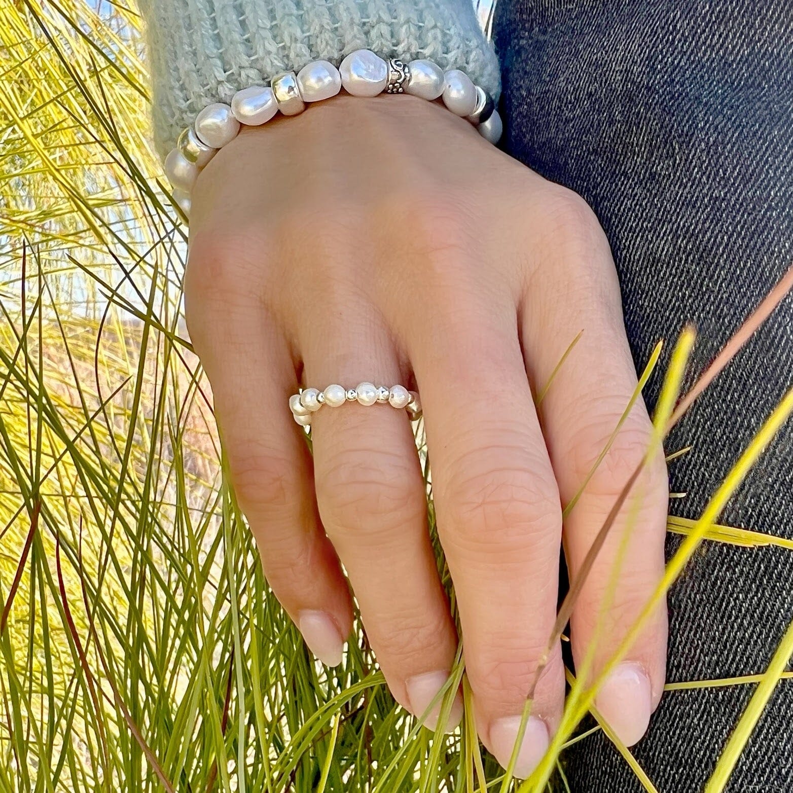 Little Miss Pearlie Ring paired with sterling silver and freshwater pearl jewelry