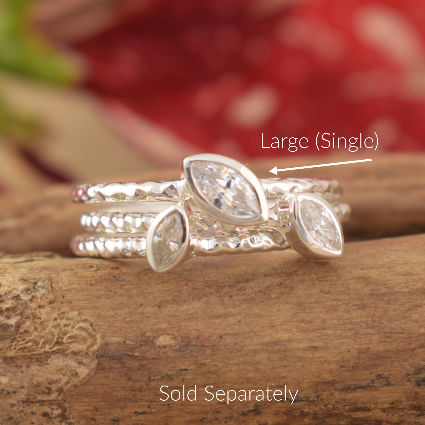 Where nature meets shimmer.  Our Vine and Shine (Single) Ring wraps your finger in a graceful trail of sterling silver, delicately carved to mimic wandering vines touched by sunlight.  Select from three Marquise CZ options (small, medium, and large). The band measures about 1.6mm in width.