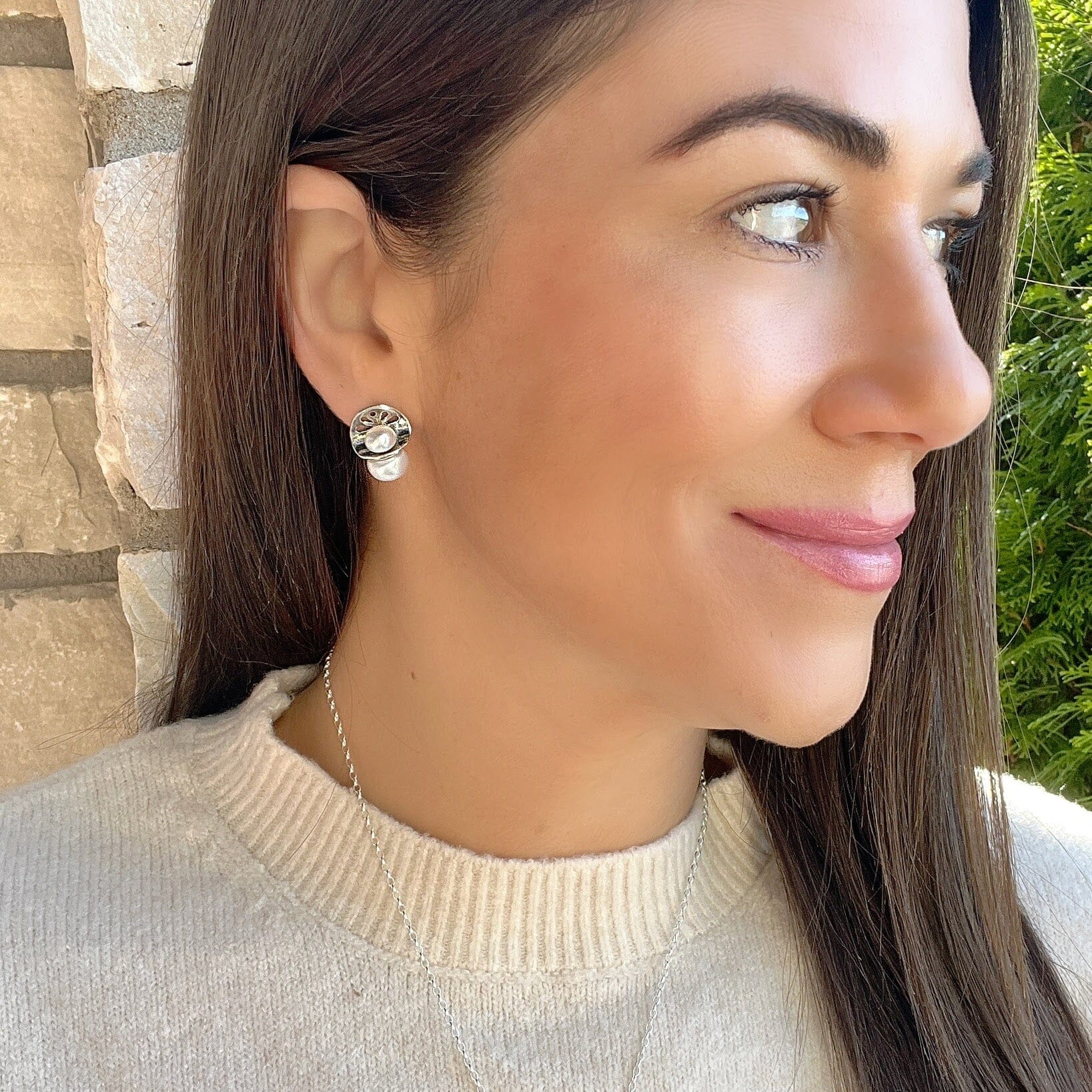 Delight comes in pairs.  Our Double Delight Earrings showcase two lustrous pearls resting above and beneath a softly sculpted silver leaf cutout.  A gentle organic curve separates the pearls and hugs the ear just right.  Light-catching, feminine, and effortlessly elegant, these earrings add a touch of natural radiance for your prettiest moments.