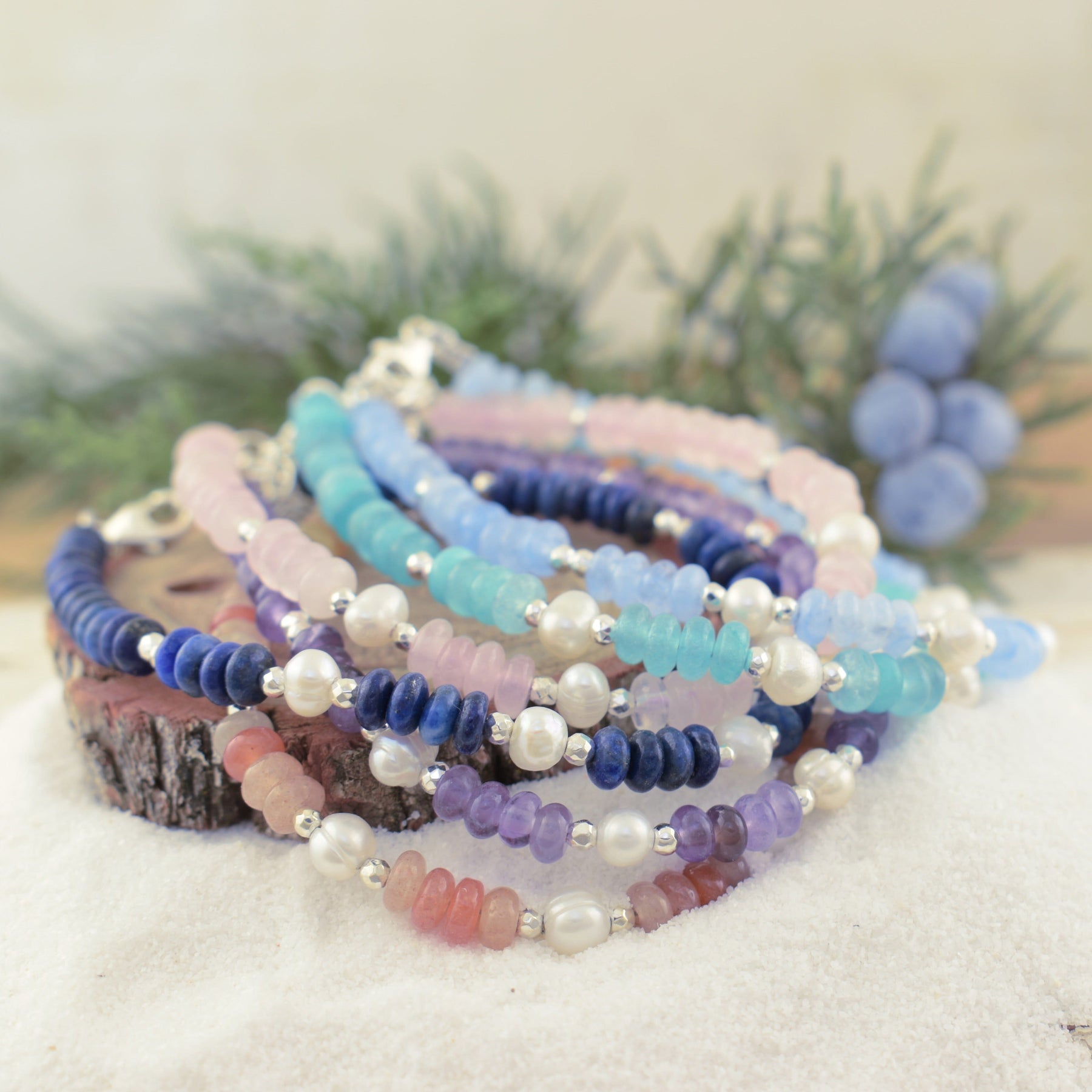 Style Stack Bracelets in lapis lazuli, blue aquamarine, amethyst, amazonite, rose quartz, and orange agate