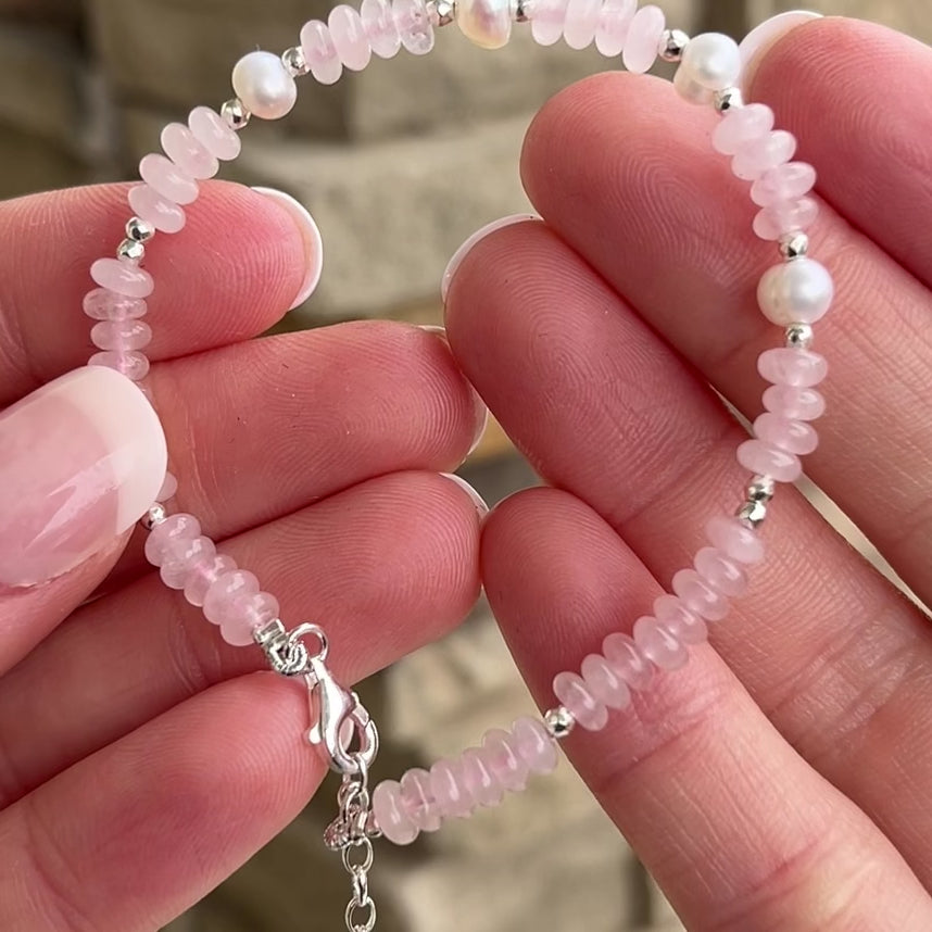 sterling silver, freshwater pearl, and rose quartz bracelet