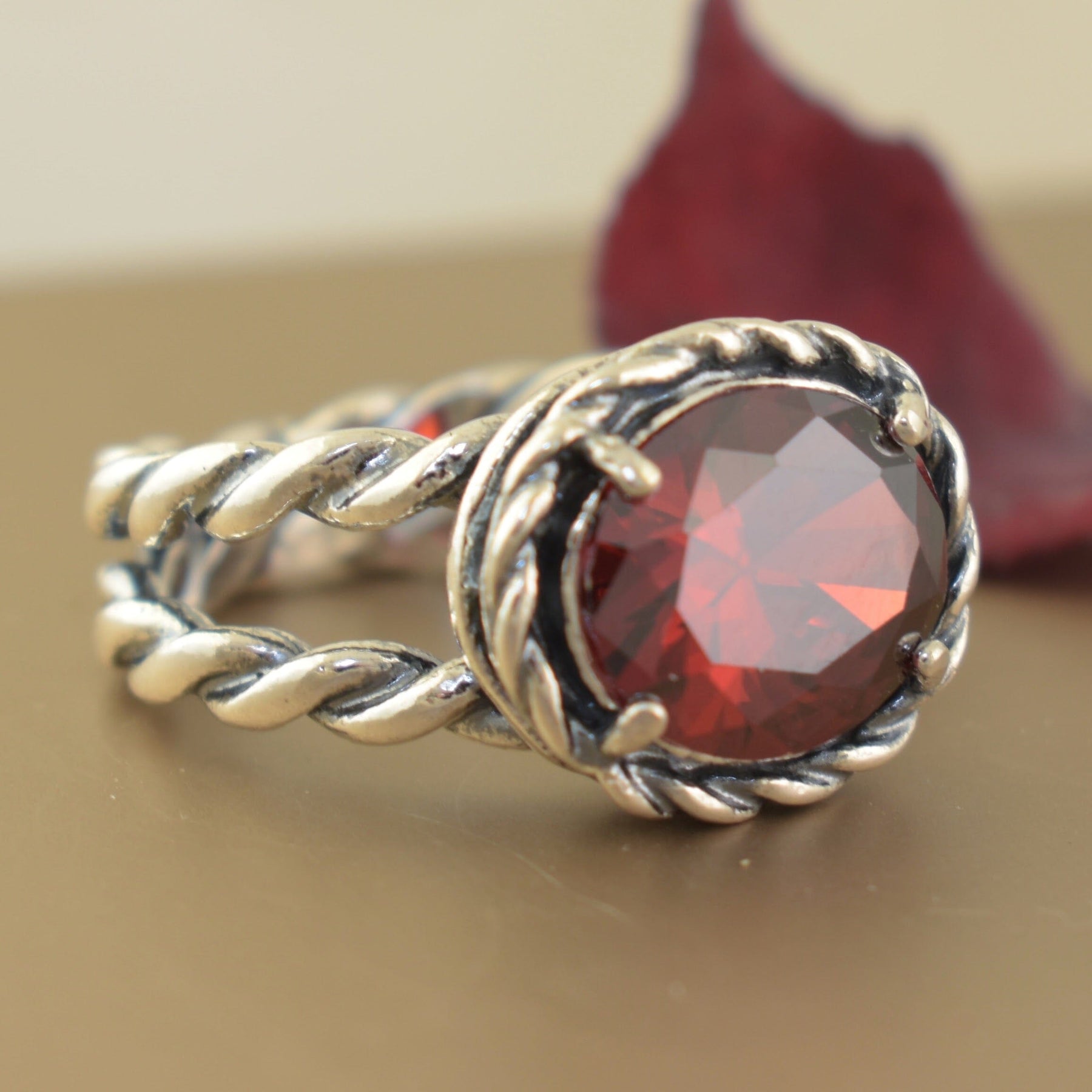 Turn up the heat with this fiery stunner. Set in a twisted silver rope band, Sass-afire brings bold color and confident sparkle to every move. The twisted band goes from 10mm in the front down to 4.5mm. The prong set oval stone measures 12x10mm - that's about 7 carats of hot sparkle! It's the perfect blend of sass, shimmer, and show-stopping style.