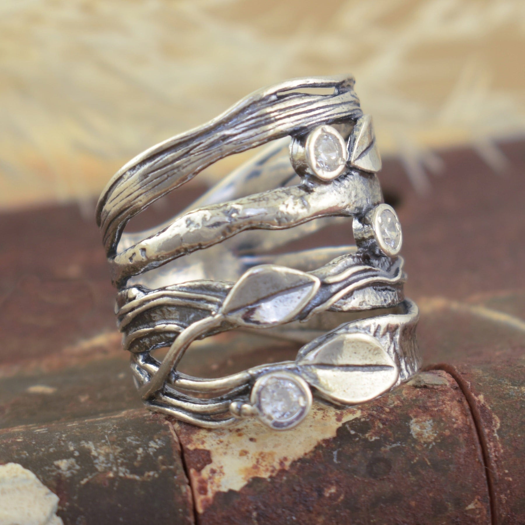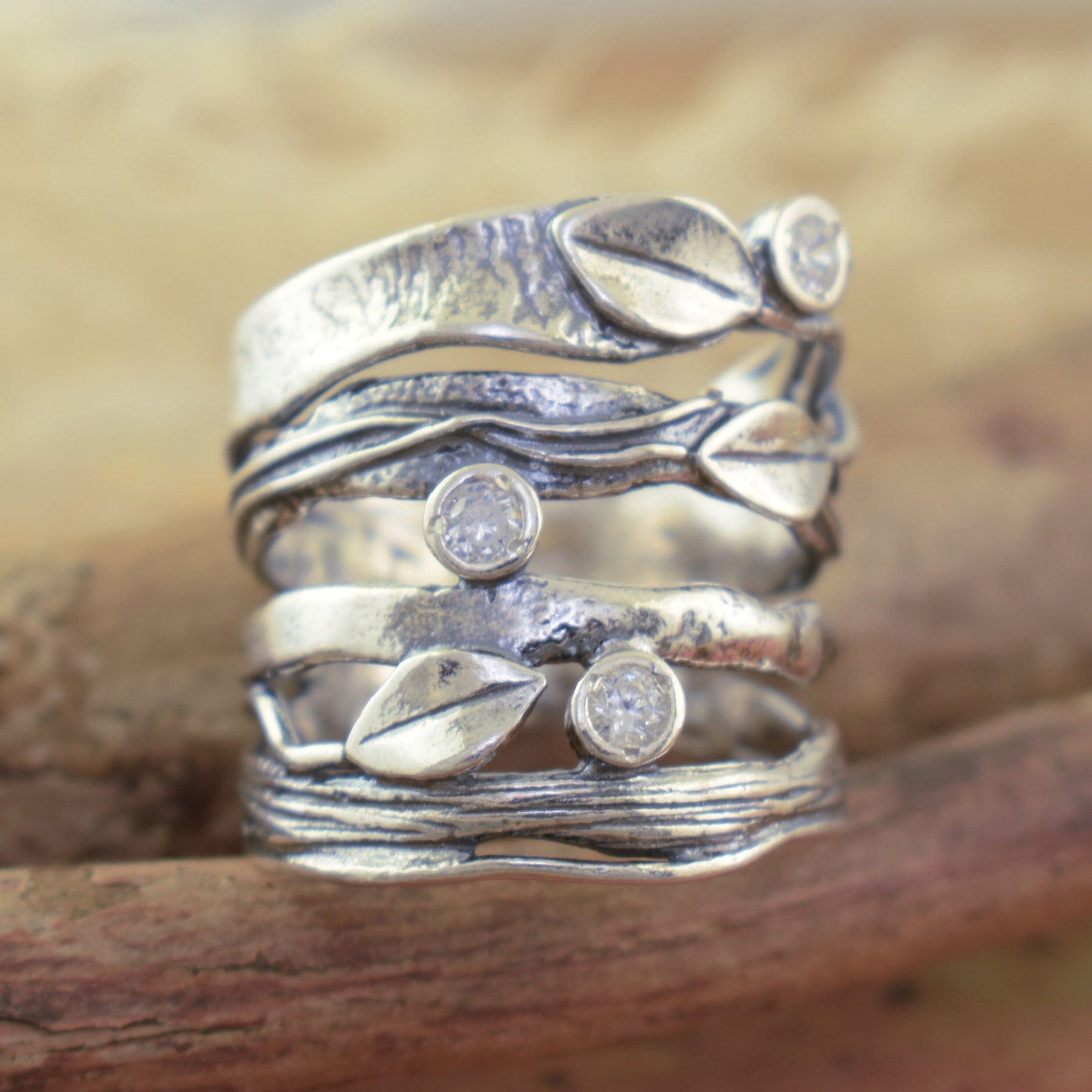 Our Branch Out Ring weaves together sculpted silver branches and sparkling CZs, symbolizing growth and resilience. This nature-inspired design creates a look that's both beautifully bold and meaningful. Our silver designer ring measures 20mm at the front and tapers to 8mm at the back. Due to the width, consider sizing up. It's a reminder to reach, grow, and shine in your own direction—one dazzling leaf at a time.