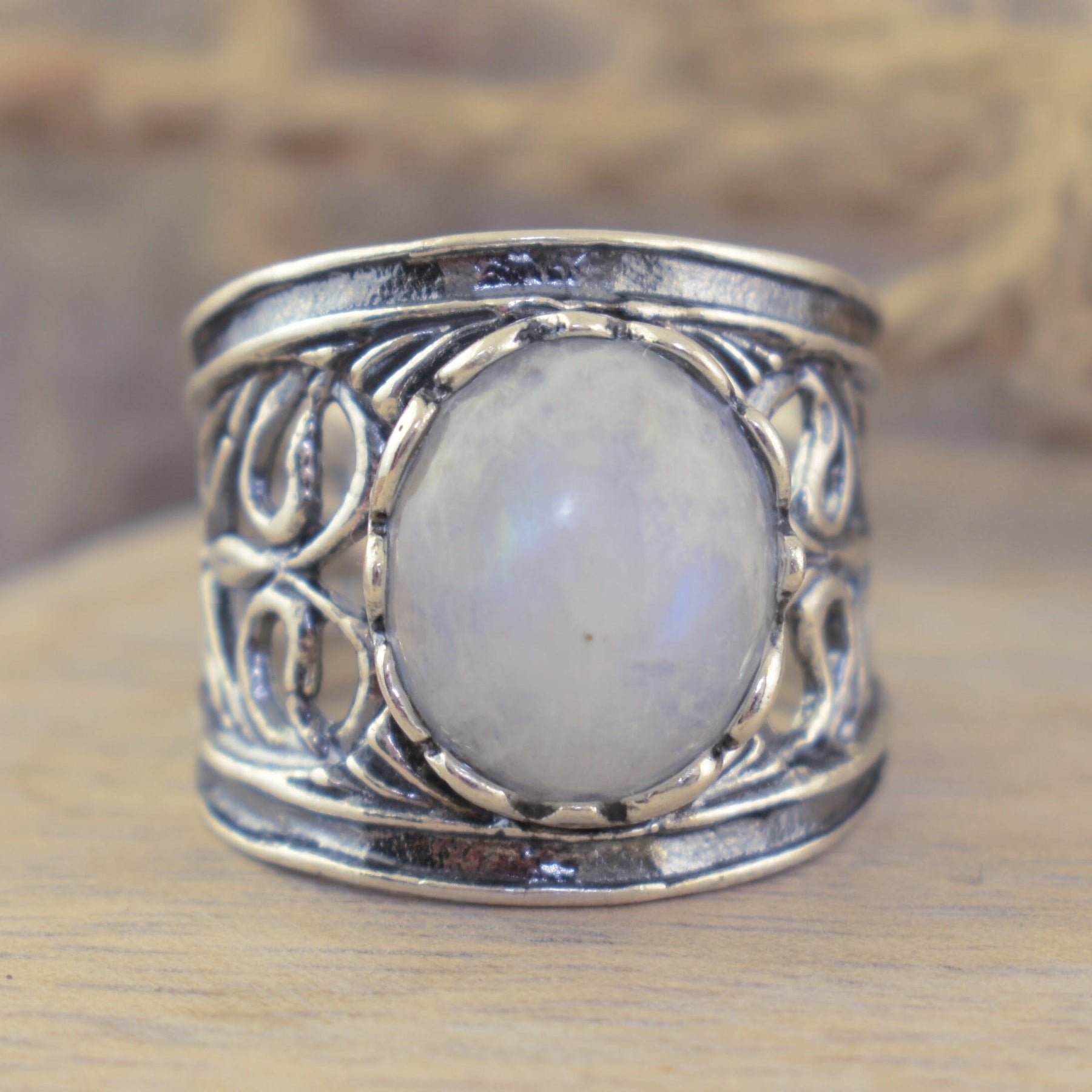 Let your imagination roam with the Wanderer Ring—a dreamy blend of airy filigree and soft moonlit glow. Its wide, artful band wraps the finger in swirling vine-like detail, while the milky center stone gives off a calming, ethereal shimmer. The band measures 18.5mm at the front and tapers to just under 7mm at the back. The center stone measures 12x10mm - about 3.5-4 carats of beautiful glow. With its handcrafted feel and free-spirited elegance, this ring is made for old souls, daydreamers, and every woman who follows her own beautiful path.