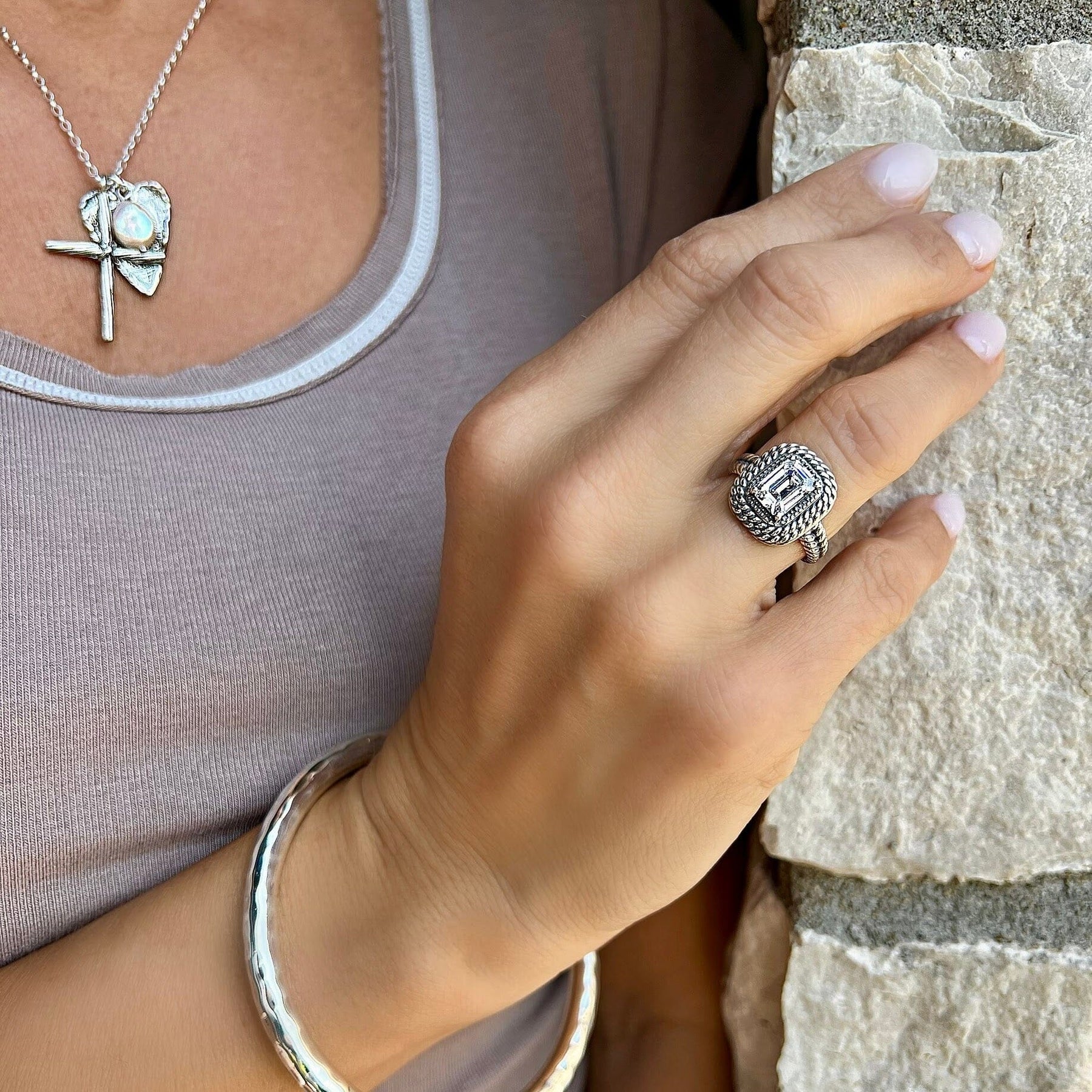 Where bold meets timeless. With its rope-detailed frame and brilliant center, 'Diamond District' delivers big-city sparkle and high-glamour confidence. Our designer silver ring measures 15mm in the front and 2mm in the back. The featured emerald cut center stone measures approximately 8x6mm, displaying about 2 carats of uptown glow! A lightweight ring with a big show—this ring is the spotlight.
